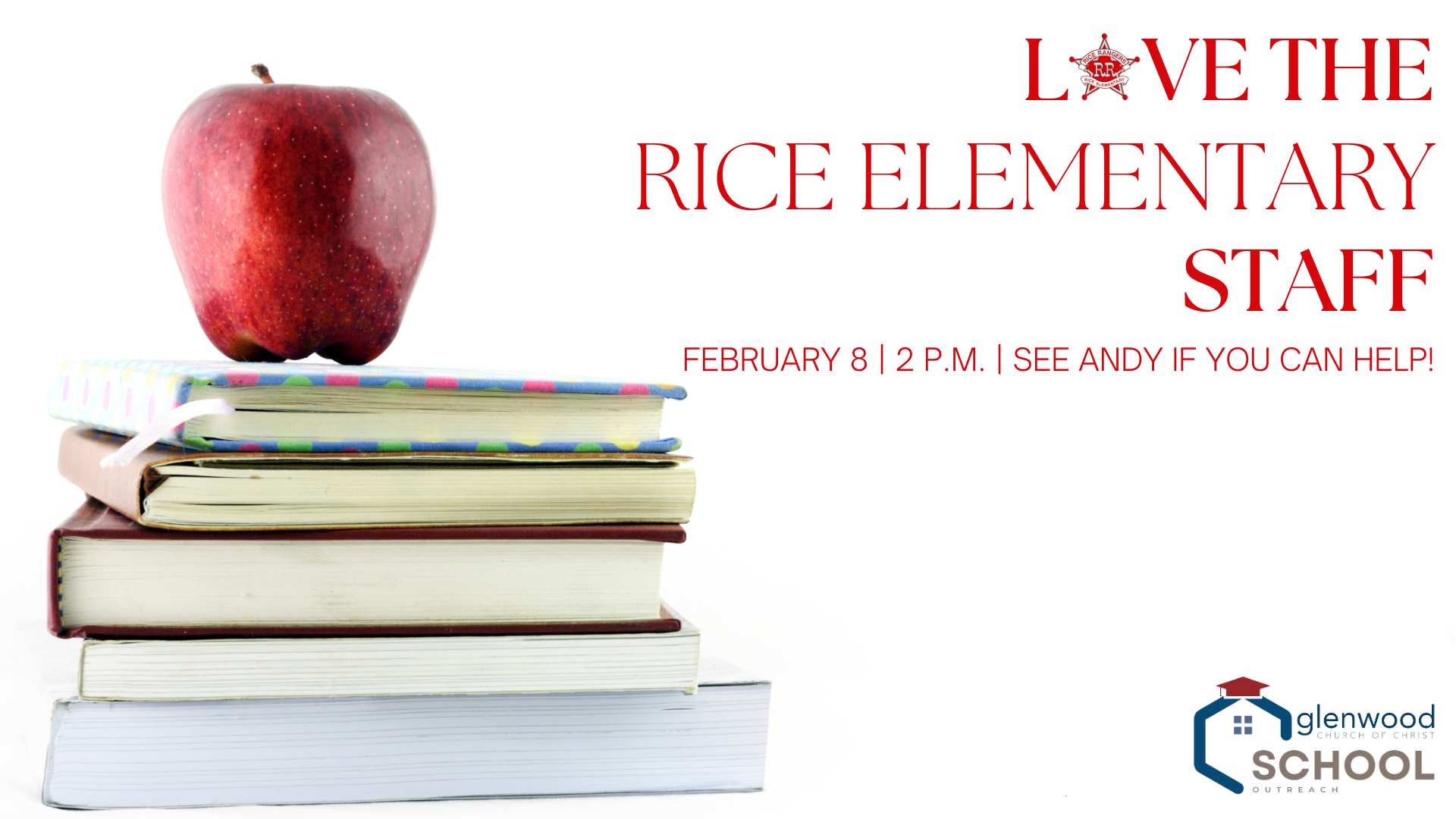On February 9, Rice Elementary staff will be on campus for teacher in-service while students are out. We’ll be blessing the staff with a stocked fridge, snacks, and—if we have enough volunteers—breakfast or lunch items.
