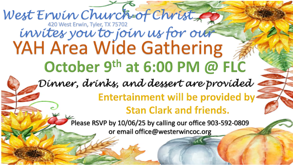 Glenwood Church 5210 Hollytree Dr, Tyler, TX, United StatesLadies’ Bible Class will resume on Tuesday, September 23, at 11 a.m. with a salad luncheon in the Gathering Room. Please bring your favorite salad to share! We will introduce […]